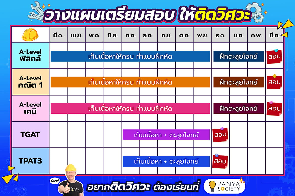 ช่วง ธ.ค.- มี.ค. : เมื่อสอบ TGAT-TPAT3 เสร็จในเดือน ธ.ค. ก็ควรมาเร่งเก็บเนื้อหาของ A-Level ให้ครบทุกวิชา และควรฝึกตะลุยโจทย์เพื่อฝึกฝีมือในการทำคะแนน หากทำได้ตามนี้ มั่นใจได้เลยว่า.. น้องจะติดคณะวิศวะในฝันได้ครับ